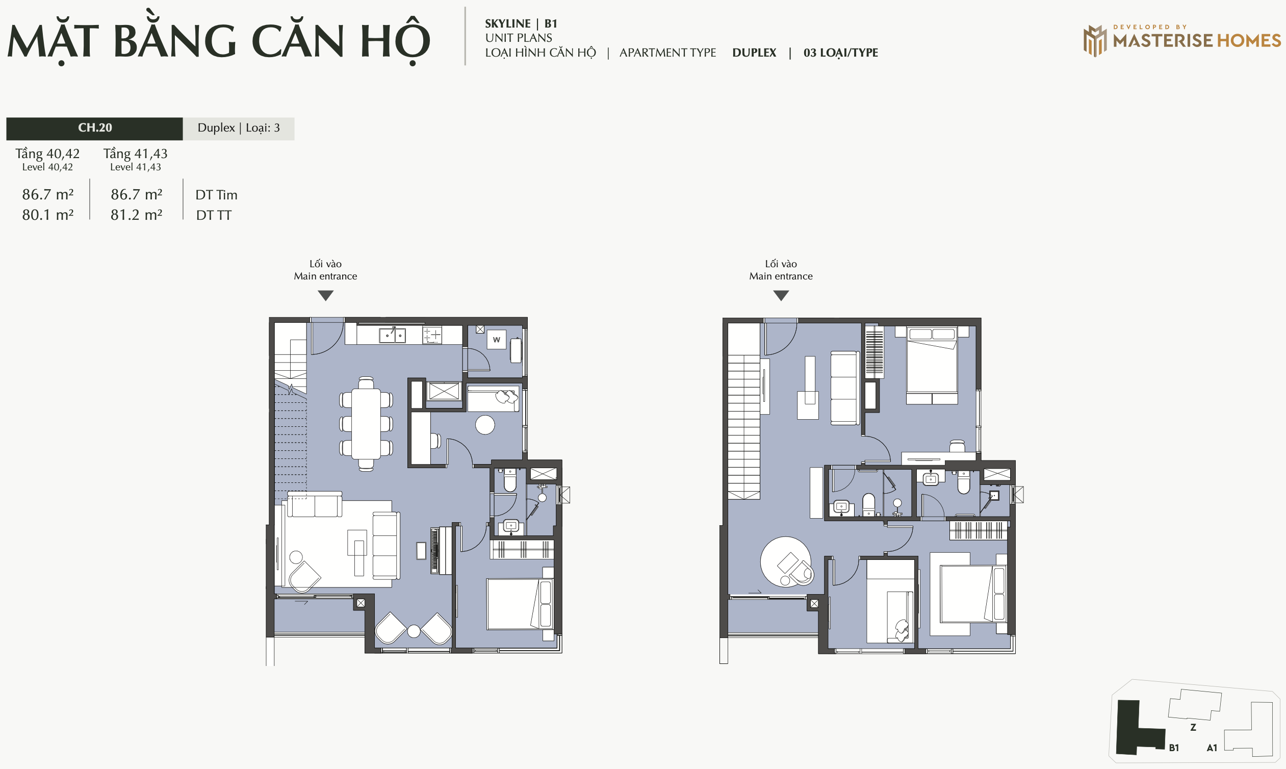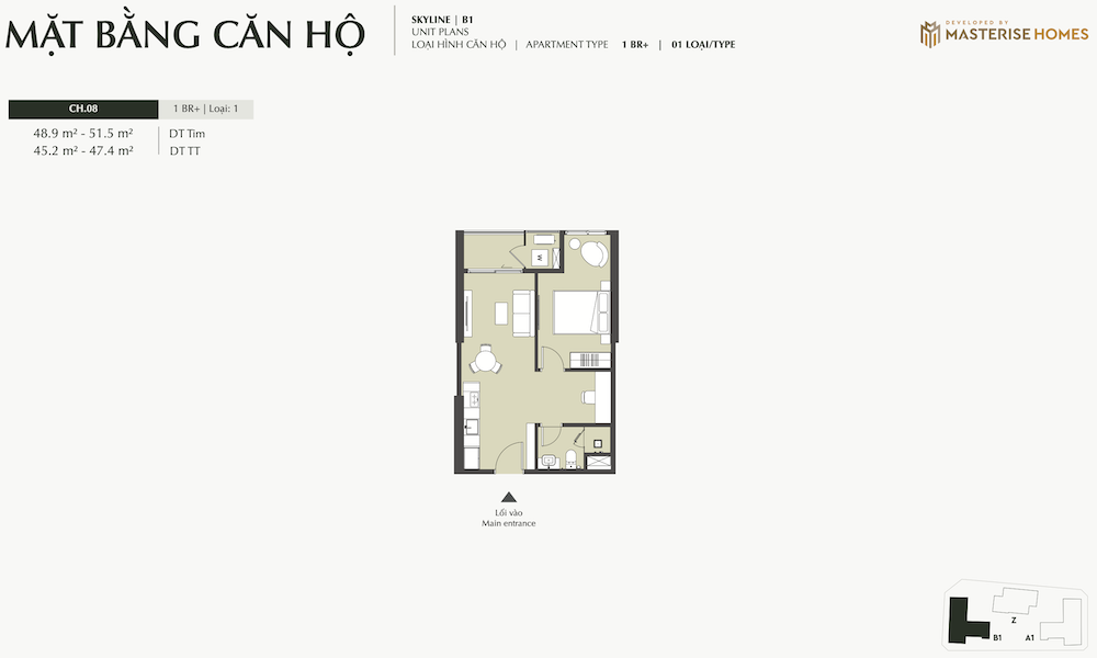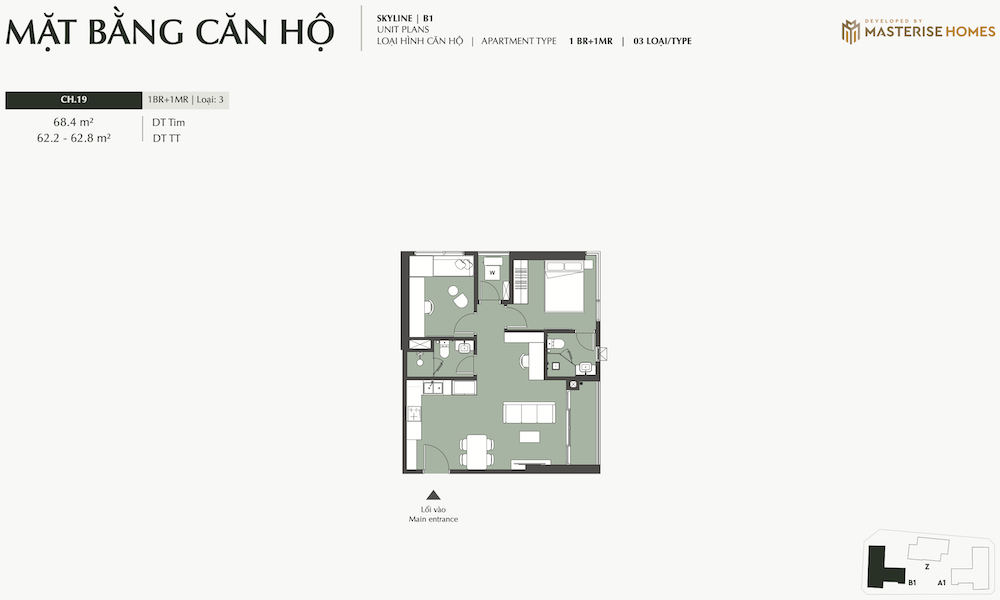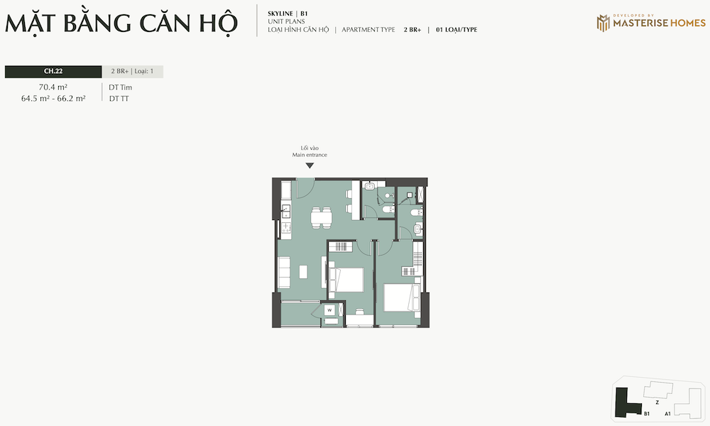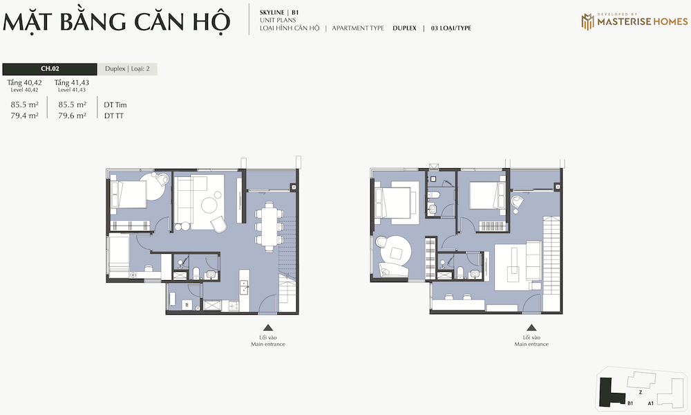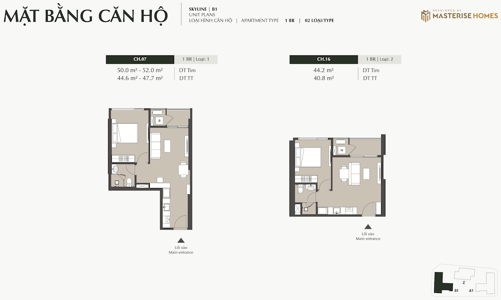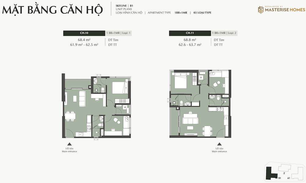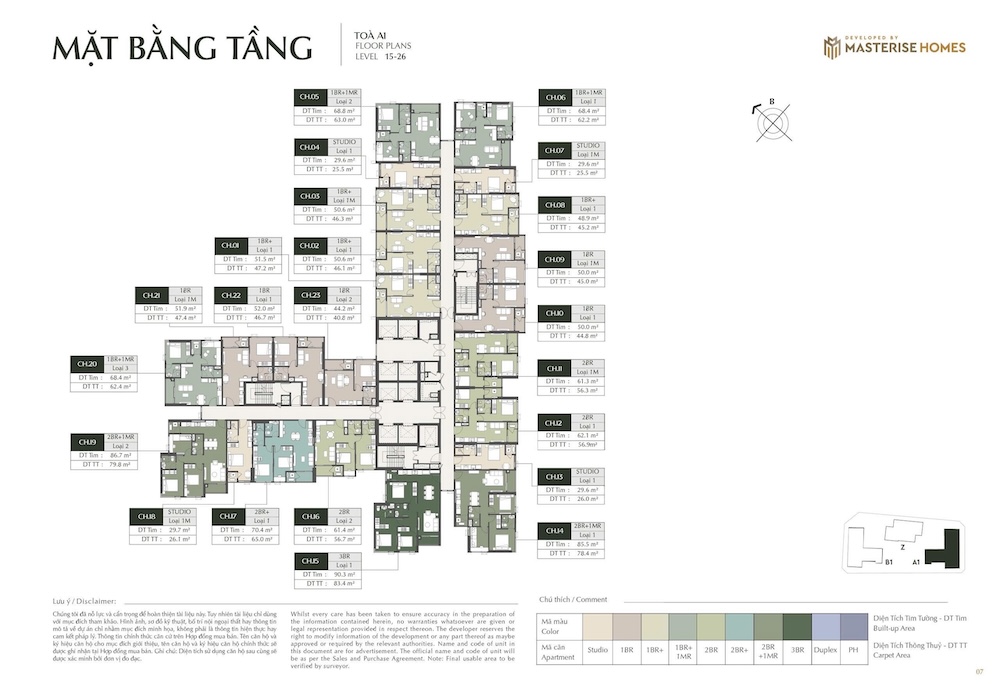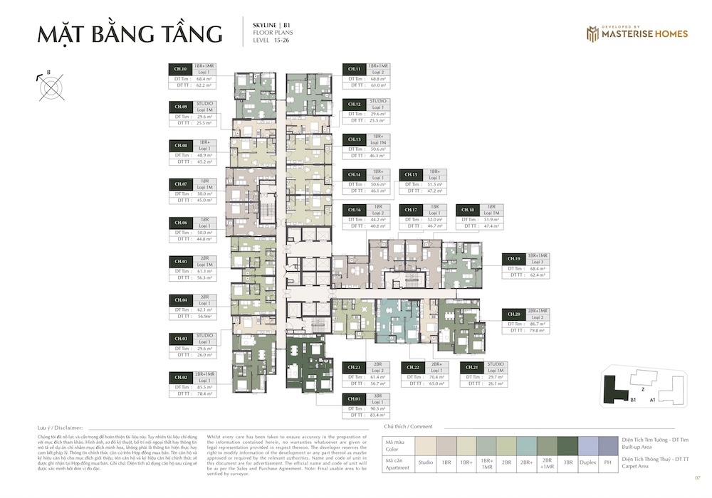 – Ký hiệu căn hộ: Các ký hiệu như “STUDIO”, “1BR”, “1BR+”, “2BR”, “2BR+”, “3BR”, “DPH” (Duplex/Penthouse Homes) được sử dụng để phân loại các loại hình căn hộ.