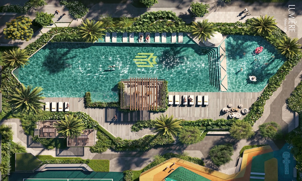 – Hồ bơi ngoài trời và khu vực thư giãn: Các hình ảnh minh họa cho thấy một bể bơi ngoài trời lớn với nhiều ghế tắm nắng, ô che và không gian xanh xung quanh, tạo cảm giác như một khu nghỉ dưỡng cao cấp.