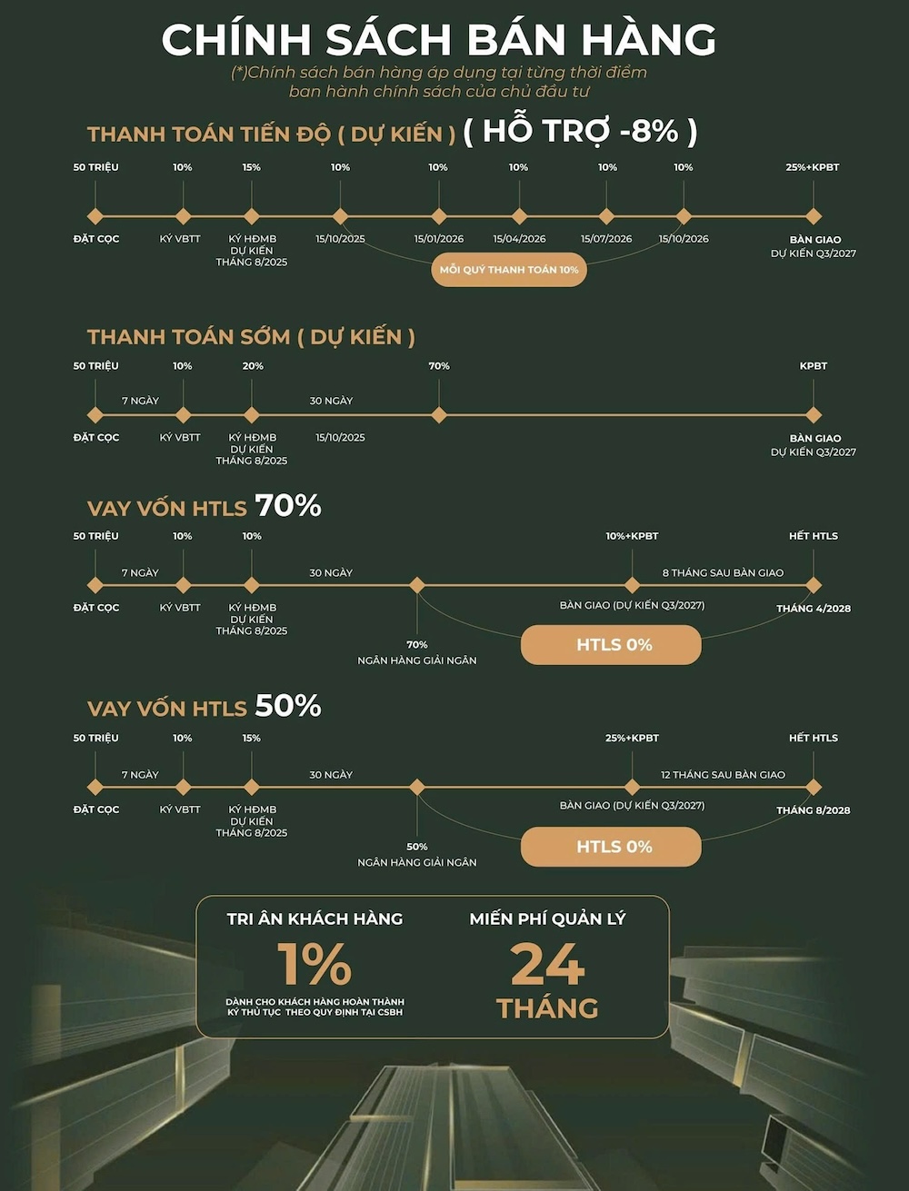 Chính sách bán hàng của Lumiere Prime Hills Đông Anh, đặc biệt dành cho tòa Skyline (B1), được thiết kế linh hoạt và hấp dẫn, nhằm tối ưu hóa lợi ích cho khách hàng và nhà đầu tư. Các ưu đãi bao gồm chiết khấu, hỗ trợ vay vốn ngân hàng với thời gian ân hạn dài, và miễn phí dịch vụ, tạo điều kiện thuận lợi cho việc sở hữu căn hộ tại dự án đẳng cấp này.
